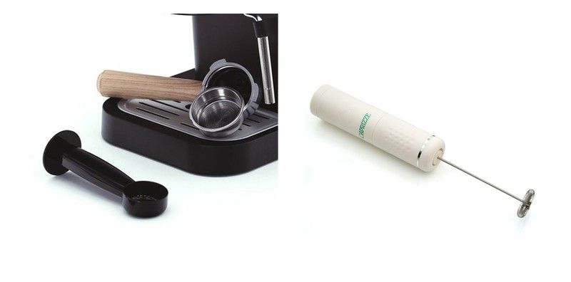 7. Du vil blive glædeligt overrasket, fordi kaffemaskinen ikke kommer til dit hjem alene, men snarere inkluderer en måleske og tamper og også en gratis USB-skummer.