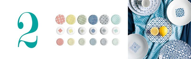 Lad os gå til den næste, med nummer 2, Guzzinis porcelæn. Det vil bringe en masse leg til bordet med 3 specifikke former: flad, dyb og dessert. Og for helt sikkert at satse på showet, 6 forskellige farver, der vil bringe spillet til live.