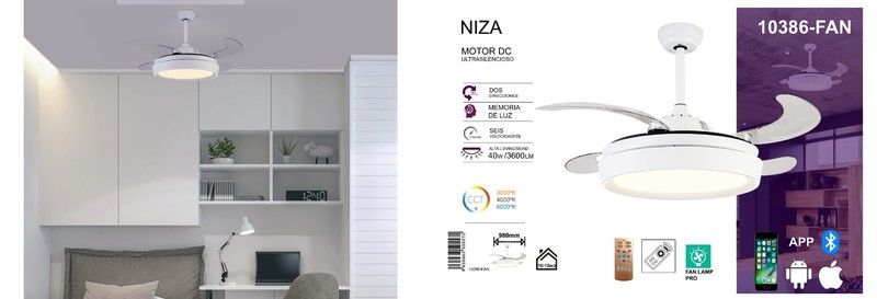 Dens forskellige hastigheder og intensiteten af LED-lyset, på en skala fra 3000k – 4000k – 6000k, du kan variere dem takket være dens fjernbetjening via fjernbetjeningen eller ved dens LAMP FAN PRO-applikation tilgængelig for iPhone og Android.
